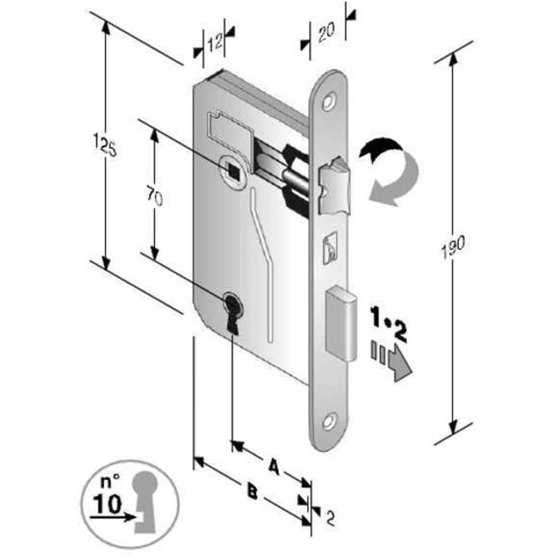 Serratura inf. patent ferro lucido interasse mm 70 Scrocco reversibile quadro mm 8 Catenaccio 1 mandata (25/30) 2 mandate (35/50) Frontale bordo tondo ferro bronzato mm 20x190 1 chiave