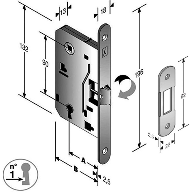 In ferro. Scrocco centrale reversibile e bloccabile, piastra e contropiastra ridotta arrotondata. Quadro 8 mm Interasse 90 mm Entrata 50 mm Finitura cromato opaco