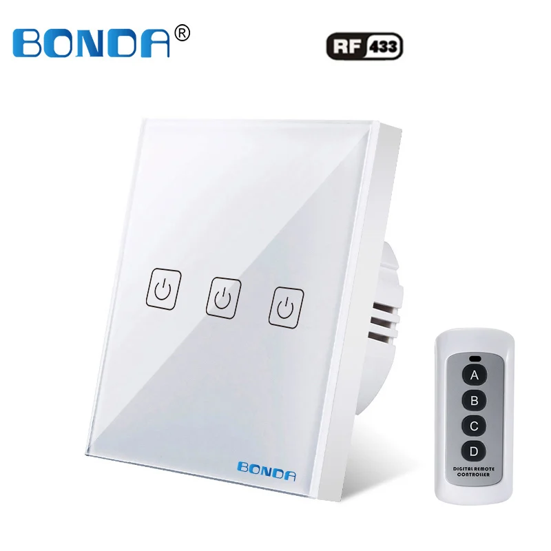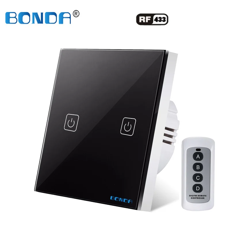 BONDA EU standard wall switch crystal glass panel remote control light switch 1Gang 1Way black light display touch switch AC220V