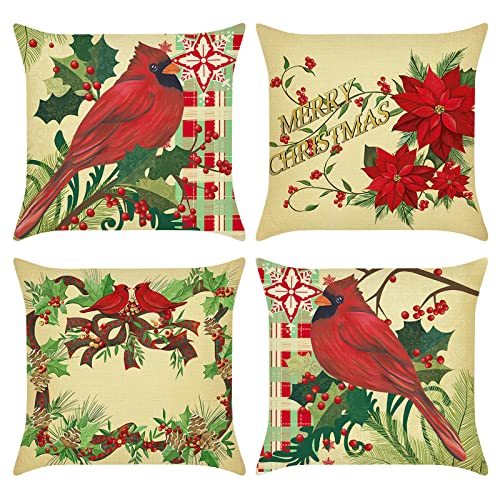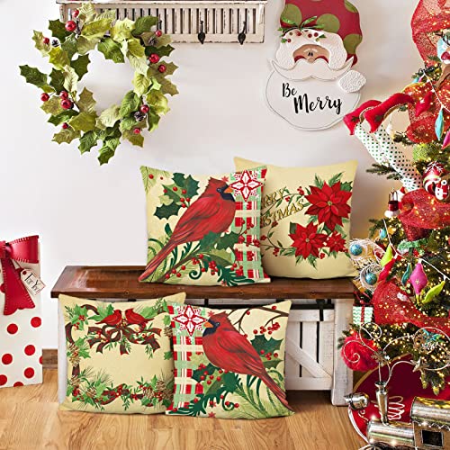 Bonhause Federe Cuscini Natalizi Rosso 45x45cm Fiore di Natale Cardinale di Natale Quadri di Bufalo Plaid Poliestere Biancheria Federa per Cuscino Divano Letto Decorazione Natalizia Set di 4