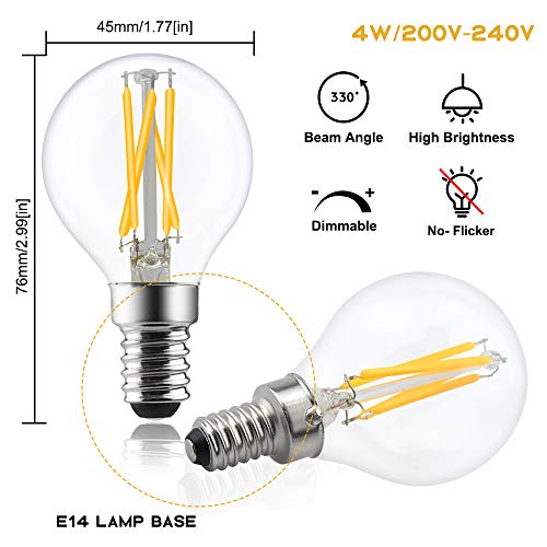 Super luminosità e design di bellezza: lampadina a filamento E14 bianca calda 2700K con chip LED COB a filamento ad alta luminosità da 4 pezzi, LED da 4 W equivalente a lampadine a incandescenza da 35-40 W. Il design a filamento retrò crea l'aspetto incandescente di un tempo con la tecnologia LED;