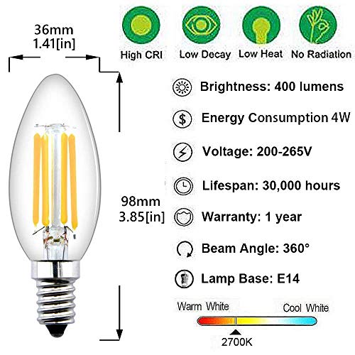 [Specifiche] - Dimensioni: ø36xH98mm, base a vite edison piccola standard E14, angolo del fascio 360 °, temperatura colore 2700K, 400 lumen, CRI≥80.