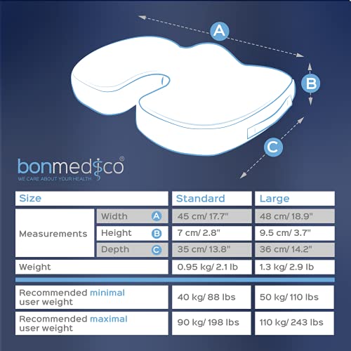 Bonmedico Cuscino da Seduta Ortopedico con Strato in Gel, Cuscino in Memory Foam per Piaghe da Decubito e per Dolore al Coccige. Per Auto, Sedia a Rotelle o Ufficio, Standard