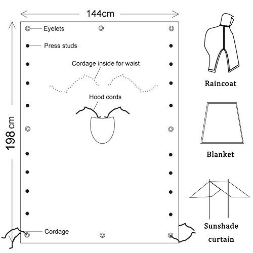 Materiale: 100% PVC Oxford, 100% impermeabile, leggero ed ecologico. molto confortevole. Spessore ideale, anche con vento forte e pioggia battente fornisce adeguata protezione. Asciuga molto bene, è facile da riporre.