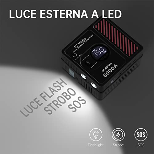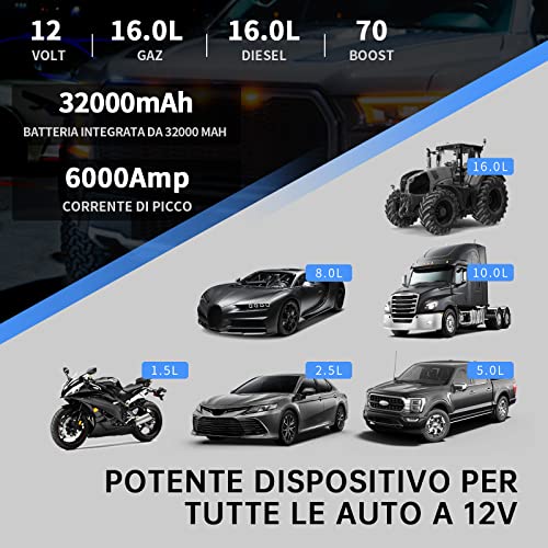 【LEGGERO MA POTENTE】 L'avviatore per auto ha una corrente di picco di 6000 A e una batteria con una capacità di 32000 mAh. Un avviatore per auto può avviare una batteria per auto da 12 V in pochi secondi. Avvia tutti i veicoli come: camper, trattore, tosaerba o motoscafi. Fino a 16L benzina/16L diesel.