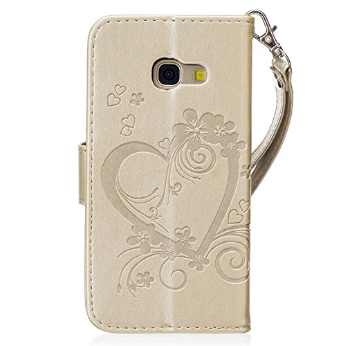 BoRan Cover Compatible for Galaxy A320/A3 2017 Custodia in Pelle Fiore e Farfalla in Rilievo, Cuore Amore Flip con Tasca, Antiurto Case con Cinghietta/Slot per Schede/Supporto Folio - Oro