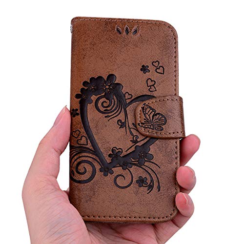 BoRan Cover Compatible for Galaxy A6 2018 Custodia in Pelle Fiore e Farfalla in Rilievo, Cuore Amore Flip con Tasca, Antiurto Case con Cinghietta/Slot per Schede/Supporto Folio - Marrone