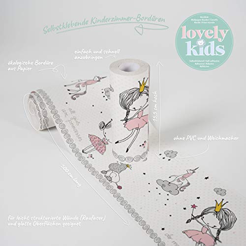 Bordi Adesivi Per Pareti Lovely Kids Magic Princess 5.00 m x 0.155 m Rosa Grigio Bianco Prodotto in Germania da A.S. Création 403755