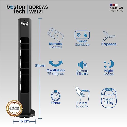 BOREAS - Ventilatore a torre: telecomando, timer fino a 7,5 ore, spegnimento automatico, pulsanti a sfioramento, altezza 81 cm, oscillazione 75°, 3 velocità, modalità notturna, WE121 (nero)