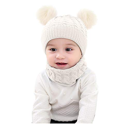 Borlai - Set di 2 Cappelli Invernali Lavorati a Maglia con Pompon e Fazzoletto da Collo, per Bambini da 1 a 6 Anni Bianco Bianco
