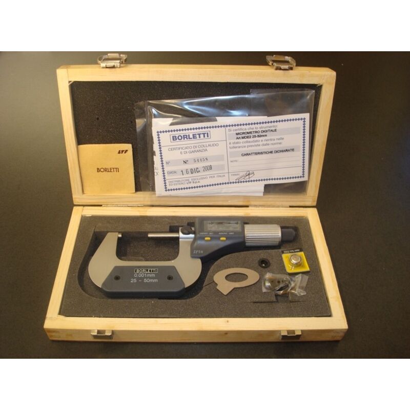Micrometro millesimale elettronico digitale per esterni. Display a cristalli liquidi con grande angolo visivo. Possibilità di conversione immediata millimetri/pollici, memorizzazione della misura effettuata, impostazione tolleranza con funzione di calibro «Passa - Non passa», misurazioni assolute/relative contemporaneamente, uscita dati alla stampante o computer. Superfici di contatto in metallo duro, spegnimento automatico dopo 5 minuti di inutilizzo. Grado protezione CEIEN 60529 IP54. Batteria: SR44-1x1,5V. Campo di misura: 25 ÷ 50 mm, risoluzione: 0,001 mm, precisione: 0,0015 mm, diametro asta vite 6,5 mm, profondità arco: 32 mm, ON/OFF, ABS/INC, preset, mm/inch, azzeramento