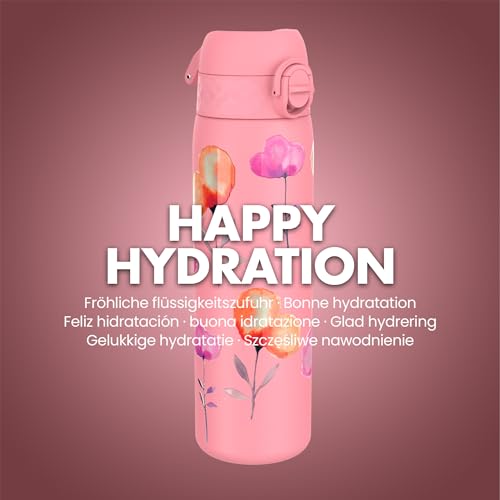 Ion8 Borraccia Acciaio, 600ml, Antisperanza, Apertura con un Dito, Lavabile in Lavastoviglie, Adatta a Portabicchieri, Manico da Trasporto, Durevole e Resistente ai Graffi, 3D Stampa, Fiori