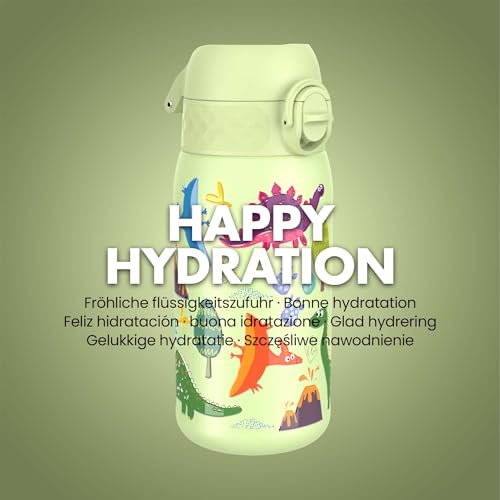 Ion8 Borraccia Acciaio per Bambini, 400ml, a Prova di Perdite, Facile da Aprire, Serratura Sicura, Lavabile in Lavastoviglie, Maniglia per il Trasporto, Facile Pulizia, Durevole, Design Dinosauri