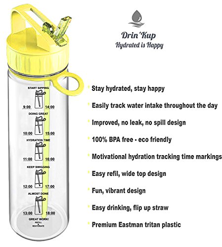 Drin'kup, borraccia per l'acqua, senza bisfenolo A, con scritte in lingua inglese e orari per bere, 900 ml, borraccia motivazionale, con cannuccia, per aiutarti a rimanere idratato, anti-perdita, in titanio durevole, bottiglia ideale per ciclisti, borraccia sportiva per allenamento, yoga, attività all'aperto e campeggio