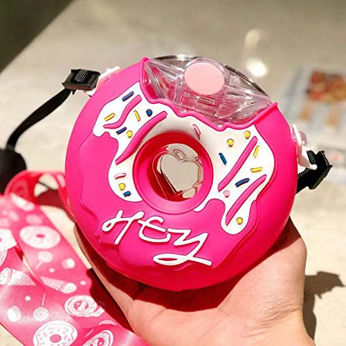 Borraccia sportiva, 380 ml, a forma di ciambella kawaii, con cannuccia, bollitore in plastica senza BPA, con tracolla regolabile, tazza da tè per bambini, sport all'aria aperta, viaggi
