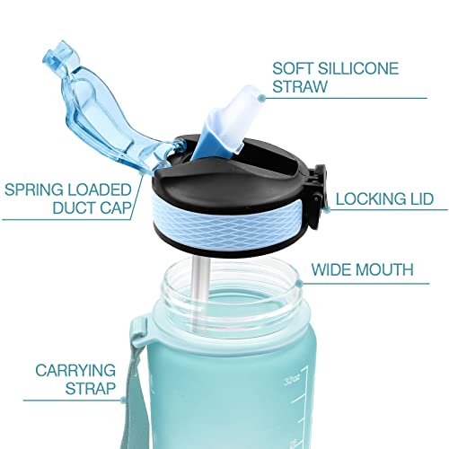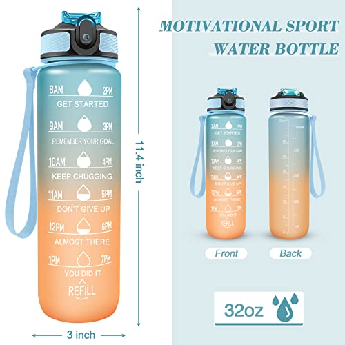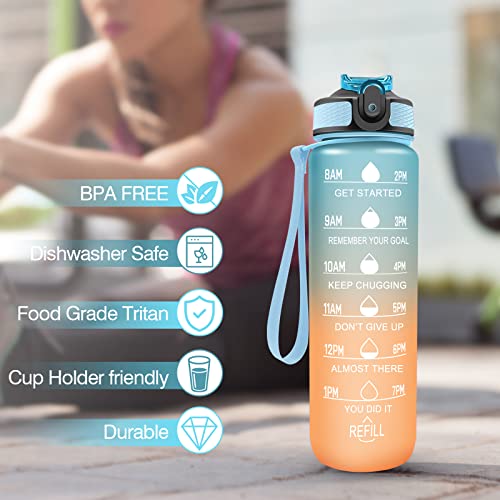 Borraccia sportiva da 1 l, a prova di perdite, con cannuccia e indicatore del tempo, senza BPA, per escursioni, bicicletta, campeggio, yoga, palestra e scuola (blu arancione)