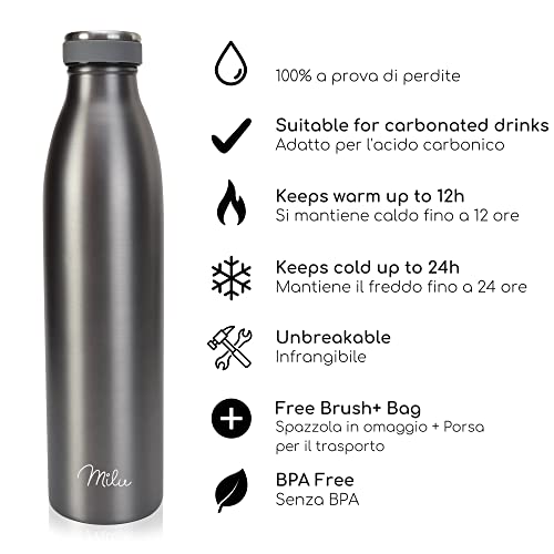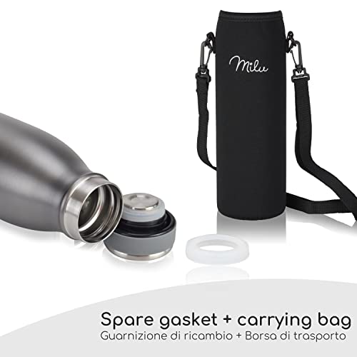 Milu Borraccia Termica Acciaio Inox - 500ml, 750ml, 1000ml - Bottiglia Acqua Termos Senza BPA, Isolato Sottovuoto, Doppia Parete, A Prova di Perdite Anche per Acido Carbonico (Grigio, 1 litro)