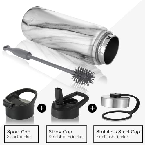 Milu Borraccia Termica Acciaio Inox - 500ml, 750ml, 1000ml (+3 coperchi) - Bottiglia Acqua Termos Senza BPA, Isolato Sottovuoto, A Prova di Perdite Anche per Acido Carbonico (Marmo, 500ml)