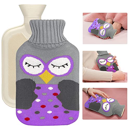 YEAP Borsa dell'acqua Calda da 2L, Borsa Dell'acqua Calda con Giacca a Maglia Morbida Copertura, Borsa dell'acqua Calda Gomma, Rimovibile e Lavabile, Rapido Sollievo dal Dolore e Comfort, Gufo Púrpura