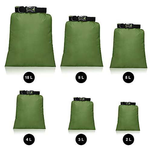 Set di Borsa Asciutta Impermeabile Sacche Stagne Impermeabili Leggeri da 15 L+ 8 L +5 L+4 L+3 L+ 2 L e 2 Tracolle Lunghe Regolabili per Kayak, Rafting, Canottaggio (Verde Militare, 6)