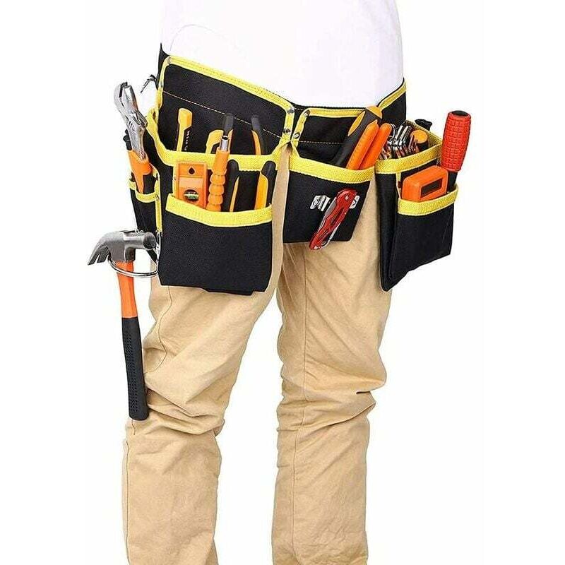 Cintura porta attrezzi con 11 tasche. Materiale: tessuto oxford premium, resistente e resistente. Cinghie regolabili: la nostra cintura porta attrezzi ha cinghie regolabili. Quindi puoi regolare le dimensioni in base alle tue esigenze. Essendo regolabile, è quindi adatto alla maggior parte delle persone. Dimensioni della cintura (L x A): 50 x 24 cm, con cinghie regolabili, per permetterti di regolare la taglia in base alle tue esigenze. Cintura portautensili multifunzionale: regalo per la festa del papà, regalo per uomo, regalo per padre e marito, ideale per elettricisti, carpentieri, artigiani, tecnici HVAC, meccanici, idraulici, cartongessisti, giardinieri, per saldatori e altri. A casa o al lavoro. Cintura tascabile porta attrezzi. Design: aspetto semplice e strati durevoli. Colore principale: nero. Con linee gialle che impreziosiscono la cintura degli attrezzi per renderla elegante e bella.