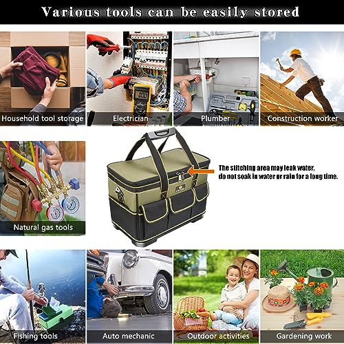 BASE IMPERMEABILE - Le borse per attrezzi hanno una base sagomata resistente all'acqua, realizzata in tessuto Oxford di alta qualità, resistente all'usura e durevole, mantiene la borsa degli attrezzi pulita e asciutta, non si rompe quando cade da un'altezza. Non devi preoccuparti che i tuoi strumenti si arrugginiscano e si bagnino.