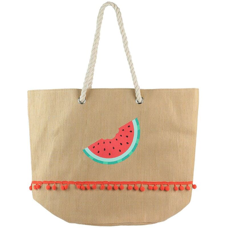 Sarete alla moda con questa tote bag che riunisce tutti i codici di tendenza del momento: un'illustrazione di anguria, materiali naturali e pompon, c'è tutto! In spiaggia, solo voi sarete notate! Dimensioni: 55x38x20cm