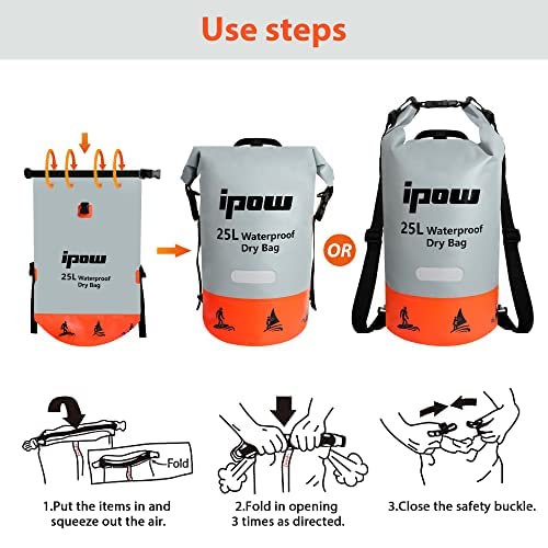 【25L di grande capacità + facile da usare】 Dry bag c'è un segno di tre pieghe sull'apertura della sacca impermeabile. Piegare la chiusura secondo il segno e chiudere la fibbia della borsa per garantire una migliore tenuta. La capacità massima è di 25L, e il lato ha anche una fibbia, che può essere ridimensionato in base alle esigenze della borsa barca impermeabile.