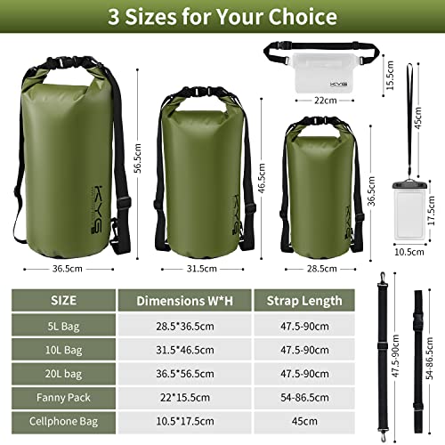 KYG Borsa Impermeabile a Tracolla Regolabile Dry Bag 5L/10L/20L Kit 3 in 9 Marsupio impermeabile, custodia per cellulare Waterproof Zaino Per Nuoto Trekking Surf Rafting Campeggio Canoa Nautica
