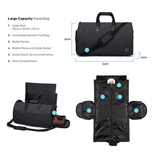 Borsa per indumenti da viaggio, borsone da viaggio, borsone da viaggio convertibile - Borsa per abito 2 in 1, zaino impermeabile, borsa da volo per weekend lungo, borsone da viaggio pieghevole (Nero)