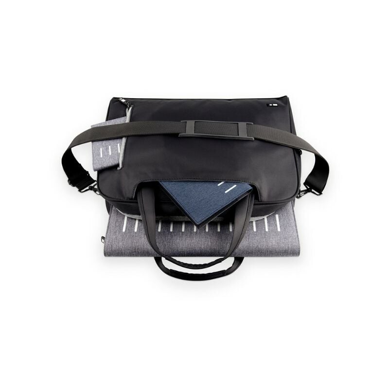 Cartella porta computer Niji in nylon extra strong, unico scomparto con vano porta note-book e tasche portaoggetti, tasca frontale, tracolla regolabile. Dimensioni: 38,5 x 29 x 10 cm.