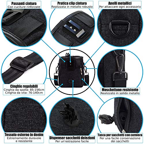 STRUMENTAZIONE PROFESSIONALE: Una borsa disegnata appositamente per il cibo dei nostri amici a quattro zampe con un abbondante spazio interno. Borsa premietti per cani con lacci. Tasca zip anche per smartphone grandi. Pratico dispenser di sacchetti per deiezioni.