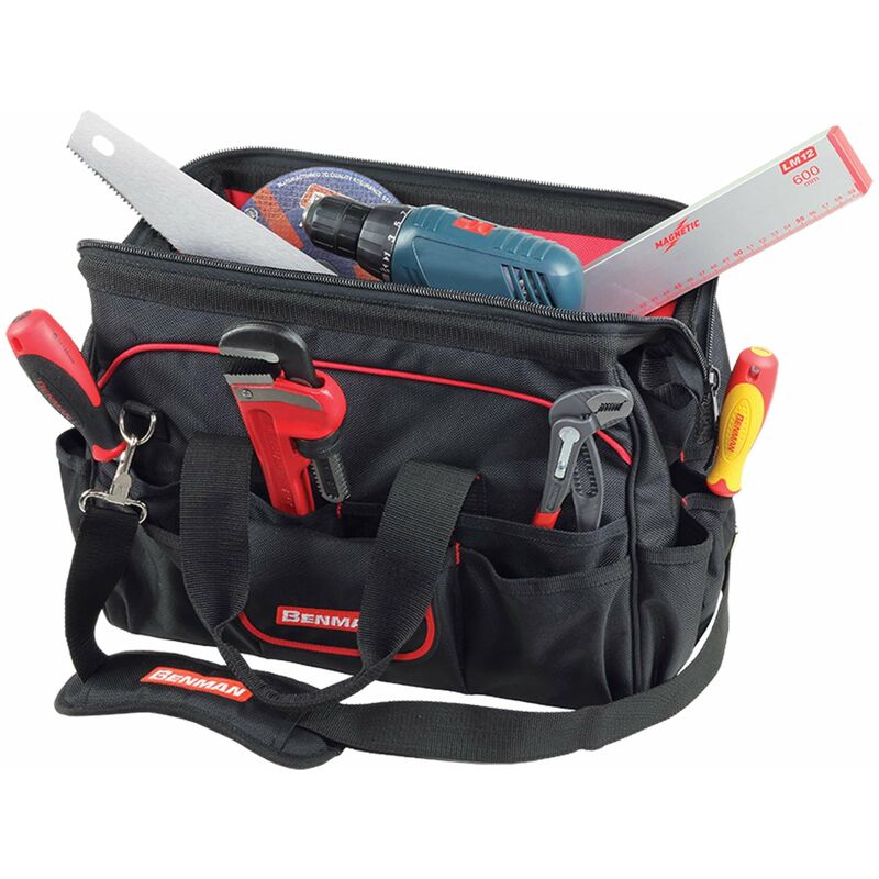 Borsa Porta Utensili a bocca chiusa Benman, con tracolla regolabile. 1 tasca esterna coperta 20 tasche esterne 10 tasche interne SPECIFICHE TECNICHE Dimensioni 260x440x330mm Utensili non inclusi