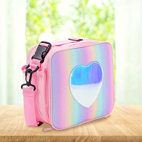 Graziosa borsa per il pranzo: lo speciale materiale glitterato arcobaleno può attirare l'attenzione della vostra bambina.