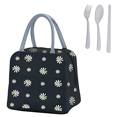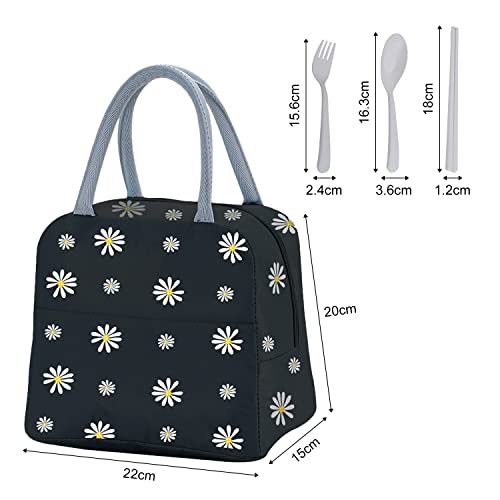1 borsa per il pranzo portatile con 1 set di forchette/cucchiai/bacchette, borsa per il pranzo a prova di perdite, Borsa tote margherita, borsa per picnic, per il campeggio, i viaggi, il lavoro(nero)