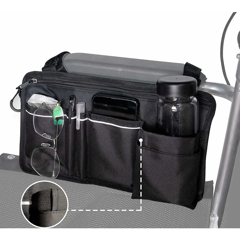 Design a 4 tasche - La nostra borsa per sedia a rotelle con un ampio scomparto con cerniera e 3 tasche aperte per adattarsi a molti piccoli oggetti comuni, tovagliolo di carta, portapillole, bottiglia d'acqua, telefono, ecc. 【 Tieni gli oggetti a portata di mano: la nostra custodia per sedia a rotelle si aggancia ordinatamente alla sponda del letto d'ospedale o al bracciolo della sedia a rotelle in modo da poter tenere tutte le tue cose organizzate e non farle cadere a terra, il che è molto comodo per gli anziani, i disabili < p> 【Bastoni magici regolabili realizzati in tessuto impermeabile】 I bastoncini magici sono regolabili per adattarsi alle braccia dei tuoi scooter da mobilità, sedie a rotelle universali e sedie a rotelle elettriche in modo che la custodia non si sfili spesso e le nostre borse per sedie a rotelle sono realizzate in materiale impermeabile che tu puoi fare shopping e viaggiare con la custodia 【Striscia riflettente】 Una striscia riflettente sul retro della borsa per
