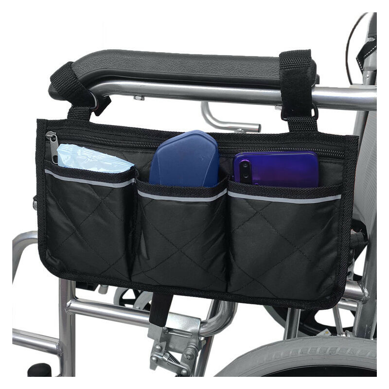 La nostra borsa per sedie a rotelle con un ampio scomparto con cerniera e 3 tasche aperte per contenere molti piccoli oggetti comuni, tovaglioli di carta, portapillole, bottiglia d'acqua, telefono, ecc. La nostra tasca per sedia a rotelle si blocca perfettamente sul binario del letto d'ospedale o sul bracciolo della sedia a rotelle in modo da poter tenere tutte le tue cose organizzate e non farle cadere sul pavimento La nostra borsa portaoggetti per sedia a rotelle ha un design a nastro magico, che può essere regolato in modo che la borsa portaoggetti del bracciolo della sedia a rotelle non venga allentata frequentemente. Questo prodotto contiene strisce riflettenti. Un nastro riflettente sul retro degli accessori della sedia a rotelle aumenta la visibilità di notte e aumenta la sicurezza. La fibbia regolabile e la custodia pieghevole possono essere collegate a quasi tutti i dispositivi mobili, adatti per sedie a rotelle, sedie elettriche, seggiolini per bambini, braccioli, schienali