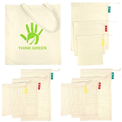 Borsa shopper in cotone Think Green. Sacchetti in rete riutilizzabili, set da 10 sacchetti per frutta e verdura. 3 taglie. Sacchetti bio. Ecologico. Zero Waste. Senza BPA.