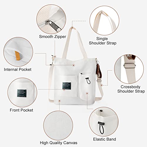 Borsa Stoffa Shopper, Macause Borsa Tote in Tela in Cotone con Cerniera, Tracolla e Tasca Esterna Borsa Messenger, per la Spesa Riutilizzabile Borse a Tracolla per Donna Ragazze Scuola Bianco