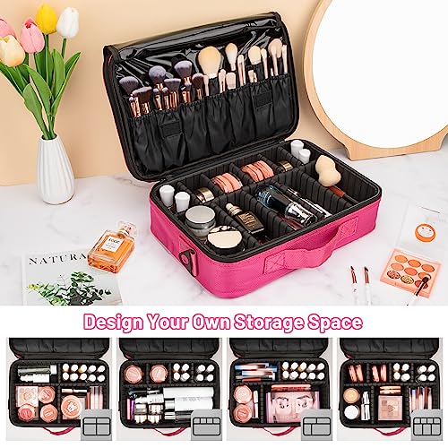 Borsa Trucco 3 Strati Professionale Makeup Bag Donna Grande Cosmetico Bag Organizzatore di Pennelli per il Trucco Beauty Case da Viaggio con Scomparti, Regolabile Tracolla Rosso rosa