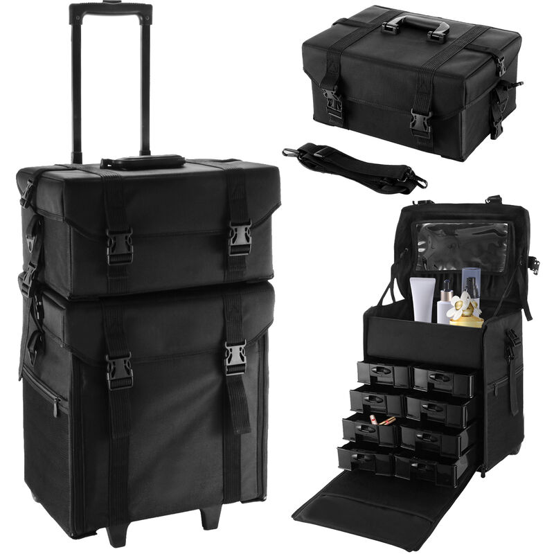 Carrello Porta Trucchi Staccabile 2 in 1 Tessuto Oxford & Rotelle Girevoli & Tracolla Questo carrello per il trucco è progettata per riporre cosmetici, gioielli e ciondoli. Ha due borse separate che possono essere collegate tramite fibbie. La borsa superiore offre due vassoi, un grande scatola e un portaspazzole in PVC. La borsa inferiore offre otto vassoi di plastica, una grande griglia e tre parti trasparenti. Comodo da trasportare con ruote per facilitare il movimento e una maniglia resistente alla corrosione per una facile manovrabilità. Carrello in nero classico Ampio spazio di stoccaggio Staccabile & Portatile Rotelle girevoli a 360° Caratteristiche & Dettagli Carrello di Trucco Funzioni 2 in 1: dimensioni della borsa maggiore è di 41 x 30 x 44cm, borsa minore è di dimensioni 41 x 30 x 22 cm. Il kit per trucco è realizzata in tessuto Oxford di prima qualità, robusto e resistente. Largo Spazio di Stoccaggio: questo carrello per il trucco professionale 2 in 1 è composto da 2
