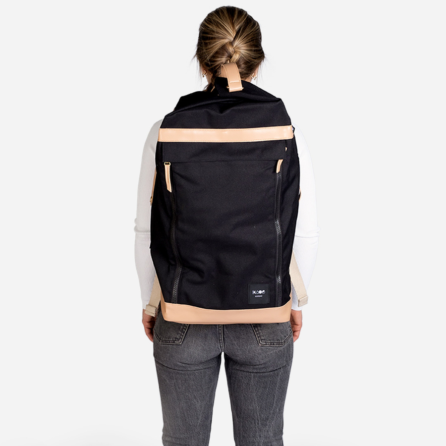 Dettagli del prodotto: Borsa da weekend con maniglia laterale per il trasporto 1 scomparto interno Lo zaino può essere diviso in tre scomparti interni più piccoli Tasca esterna per il passaporto Scomparto imbottito per laptop con chiusura a zip Spallacci imbottiti Colore: nero / naturale Materiale e cura: Materiale: poliestere riciclato, pelle (vegana). Dimensioni e peso: Lunghezza x larghezza x altezza 28 x 28 x 50 cm Capacità: 40 litri Incluso nella consegna: Borsa da weekend Attenzione: la decorazione non è inclusa