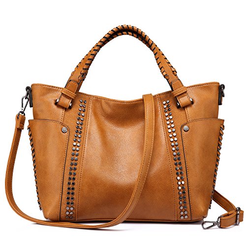 Aspetto di moda - Rivetto ordinato, bobina di ferro intorno alla corda di cuoio, coppia con disegno della cintura di tessitura della maniglia. Un po 'di stile punk rock, ma non troppo brillante, rendono questa borsa alla moda e decente