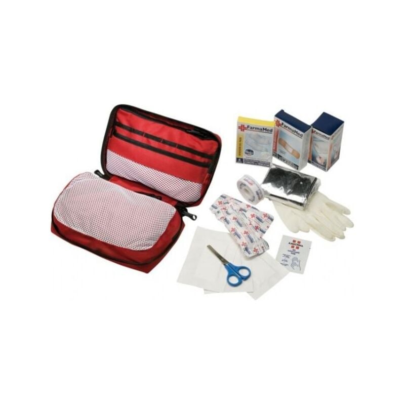 BORSELLINO KIT SOCCORSO 2 FERRINO Pratico e capiente borsello multi comparto. Maniglia ed anelli per il trasporto. Passante posteriore per essere agganciato alla cintura. Occorrente per primo soccorso incluso: - 2 bende di garza sterili 5 mt x 7 cm - rocchetto in tela 7,5 m x 1,25 cm - cerotti per vesciche • benda elastica autoaderente 4 mt x 6 cm - cerotti impermeabili 30 pz - 3 set di salviette amuchina - 3 compresse di garza idrofila 18x40 cm - forbici - 1 paio di guanti in lattice • telo survival Dimensione: 22x13x6 cm