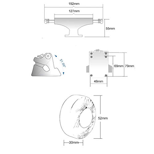 1. Accessori per skateboard: staffa cava da 5 pollici in lega di alluminio-magnesio, ruota in PU 52 x 30 mm, cuscinetto ABEC-11 a colori, guarnizione in gomma da 3 mm, chiodo a ponte in oro 29 mm, manicotto in lega di alluminio.