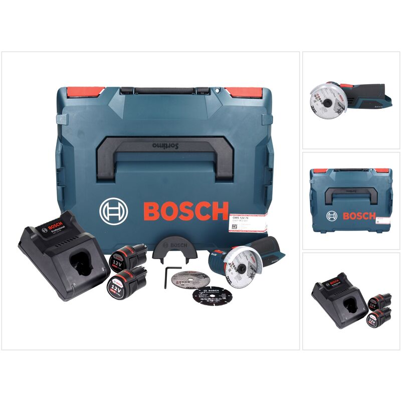 Dotazione: - 1x Bosch GWS 12V-76 Professional 12 V Smerigliatrice angolare a batteria - 2x Batterie Bosch GBA 12 V 3,0 Ah / 3000 mAh ( 1600A00X79 ) - 1x Caricabatterie Bosch GAL 1230 CV Professional - 1x Mola da taglio in metallo duro, Carbide Multiwheel, 76 x 10 mm ( 2608623011 ) - 2x Mole da taglio Inox, Expert for Inox, 76 x 10 mm ( 2608601520 ) - 1x Valigetta L-Boxx 102 ( 1600A001RP ) - 1/2 Inserto termoformato per L-BOXX per batteria e caricatore - 1/2 Inserto termoformato per L-BOXX per GWS 12V-76 ( 1600A00F0F ) Descrizione prodotto: La smerigliatrice angolare a batteria Bosch GWS 12V-76 Professional è la prima della sua categoria, grazie al potente motore EC senza spazzole (brushless), che garantisce un lavoro rapido ed efficiente. Sempre grazie al suo motore, la smerigliatrice ha un design estremamente compatto ed ergonomico per lavori di difficile accesso. Il bloccaggio del mandrino consente di sostituire i dischi in modo rapido e semplice. Per una maggiore sicurezza, la