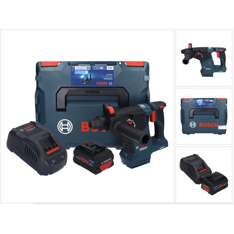 Contenuto della consegna: - 1x trapano a percussione a batteria Bosch GBH 18V-24 C Professional - 1x impugnatura supplementare ( 2602025141 ) - 1x arresto di profondità ( 1613001009 ) - 1x batteria professionale Bosch ProCORE 18 V 5,5 Ah ( 1600A02149 ) - 1x batteria Bosch Schnellladegert GAL 1880 CV ( 1600A00B8G ) - 1x L-BOXX - 1x inserto corrispondente Descrizione del prodotto: Il GBH 18V-24 C Bosch Professional è un trapano a percussione a batteria potente e versatile, con un'elevata energia di percussione di 2,4 J e una tensione della batteria di 18 V. Con una velocità di percussione da 0 a 4.350 bpm e una velocità nominale da 0 a 980 min-1, svolge il lavoro in modo rapido ed efficiente. Il peso ridotto di 2,9 kg lo rende un partner affidabile per tutti i lavori di foratura. Grazie al portautensili SDS plus, è in grado di affrontare facilmente lavori pesanti nel calcestruzzo e nel metallo. La sua capacità di foratura nel calcestruzzo con ganasce a martello è compresa tra 4 e 24