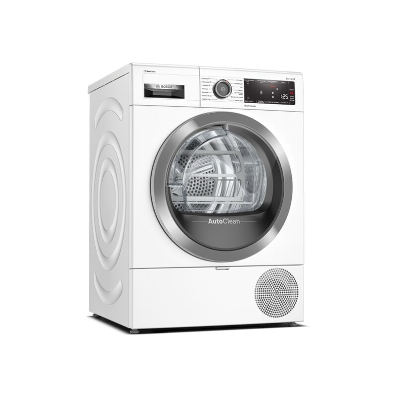 L'asciugatrice a pompa di calore Bosch WTX87K90FR AutoClean Series 8 con trattamento a vapore Iron Assist semplifica la cura del bucato, rendendo persino superflua la stiratura. Tecnologia AutoClean senza filtro porta: prestazioni energetiche ottimali, senza la necessità di svuotare il filtro ad ogni ciclo. Iron Assist: un programma a vapore che liscia i vestiti e riduce il lavoro di stiratura. AutoDry: asciuga il bucato in modo automatico e preciso come piace a te. Design antivibrante: stabile e silenzioso. Essiccatore ecologico con refrigerante ecologico (R290). Tipo di prodotto: asciugatrice a carico frontale. Portata nominale (kg): 9. Tipo di essiccazione: Condensazione. Classe di efficienza energetica: A+++. Consumo energetico annuo ponderato (AE C) in kWh/anno: 193. Tipo di asciugatrice: asciugatrice automatica domestica. Consumo energetico per il programma cotone standard a pieno carico (kWh): 1,61. Consumo energetico per il programma cotone standard a mezzo carico (kWh): 0,90.