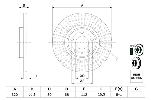 1 disco freno singolo / Asse anteriore / Dimensioni del disco: diametro 320 mm, spessore 30 mm / Tipo di disco: Ventilato / Trattamento della superficie: rivestito / alto tenore di carbonio / Numero di fori: 5 / Certificato ECE-R90