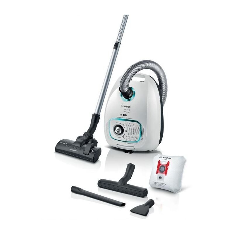 BOSCH - GL40S - ProHygiene - aspirapolvere con sacchetto - bianco - 69 dB - Filtro UltraAllergy - 10m - 4L - spazzola universale - spazzola per parquet - acc. 2 in 1 - acc. materasso - sacchi antipolvere antiodore - ugello radiatore XL - 4 ruote multidirezionali